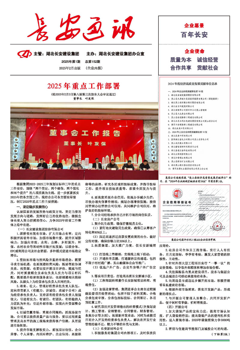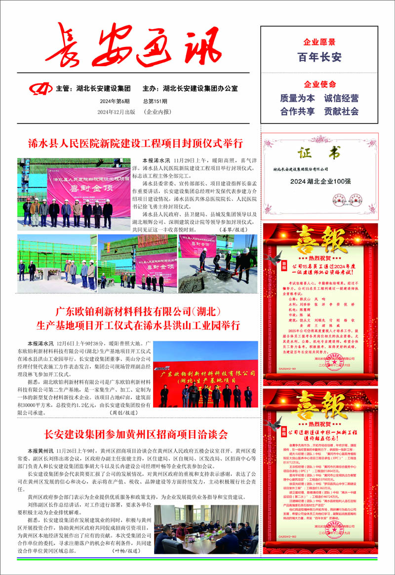 • 2025-11-03 長安建設集團聘任徐正新同志為湖北長安建設集團股份有限公司總經理、余招剛同志為英山縣長安房地產開發有限公司總經理